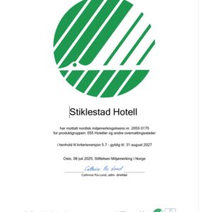 Både hotellet (med restauranten) og kulturhuset er Svanemerket, noe vi er veldig stolte av. Det er godt å være med på et felles løft for miljøet! Dette er en krevende med viktig jobb! Vi fikk akkurat fornyet lisensen vår til 2027.